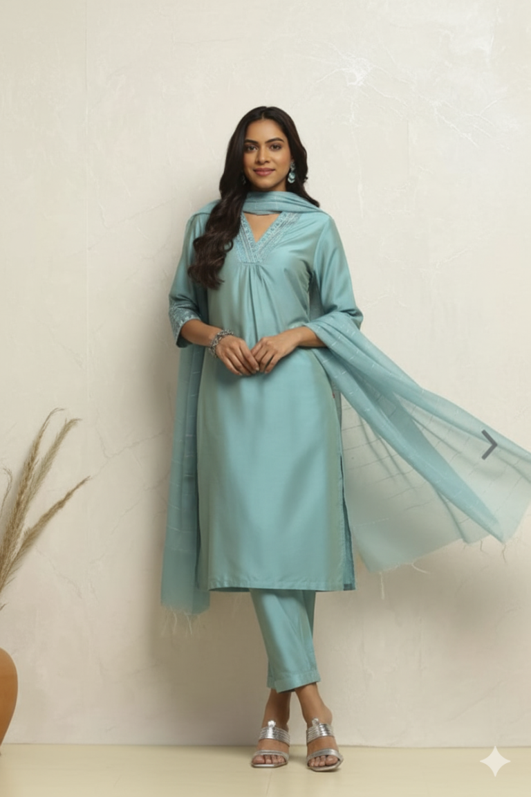 Powder Blue Solid Festive Straight Suit Set