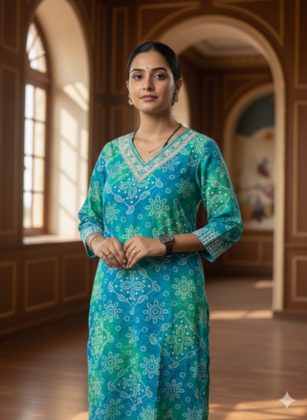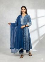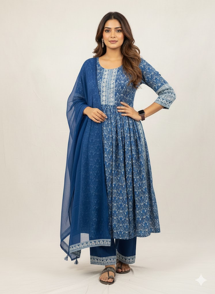 Embark on a seamless fusion of ethnic charm and casual sophistication with this gathered kurta palazzo suit set, expertly crafted from rayon fabric. The kurta features a slitted round neck and three-quarter sleeves, adorned with ethnic and floral embellishments, creating a graceful flared pattern. Paired with a palazzo adorned with a designed band at the end and a matching lace dupatta, this ensemble exudes elegance. Complete your look with oxidized earrings, bangles, and ring-toe sandals for a chic and stylish appearance.