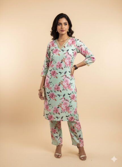 women light green suit with a pink floral rose print