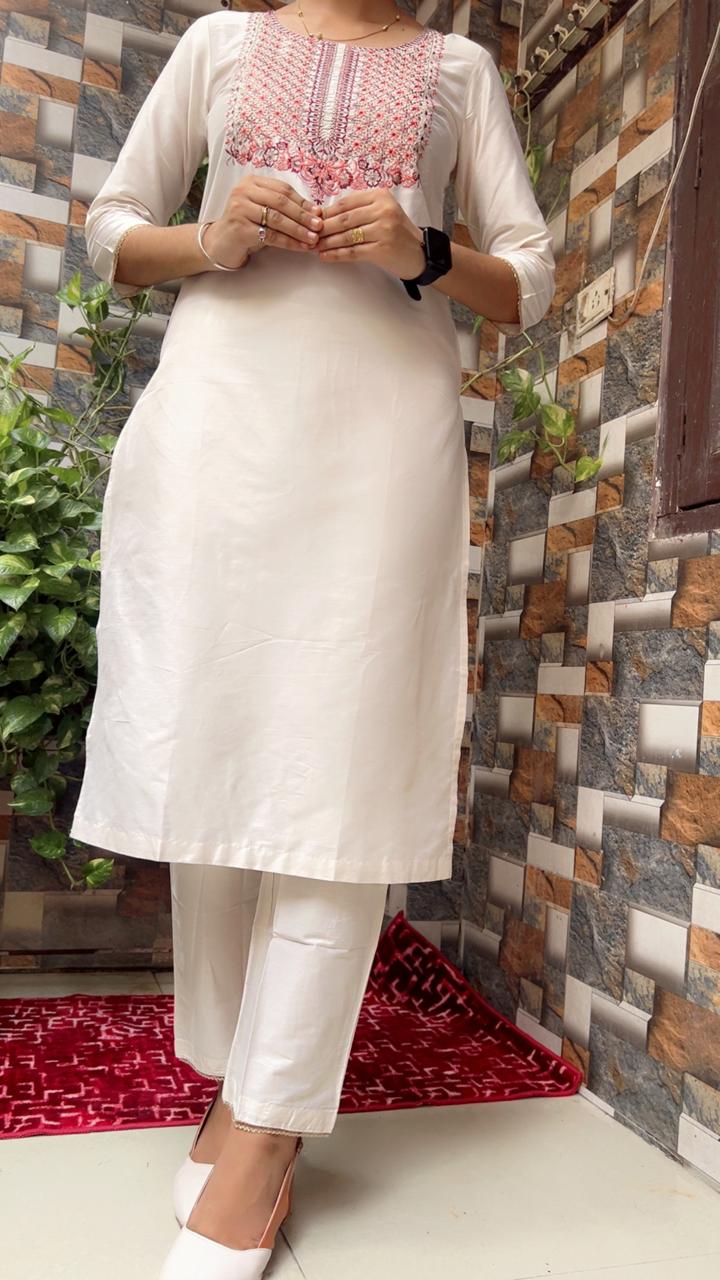 Be the first to review “ZARAM WOMEN OFF WHITE SLIK BLEND Straight Suit Sets” Cancel reply